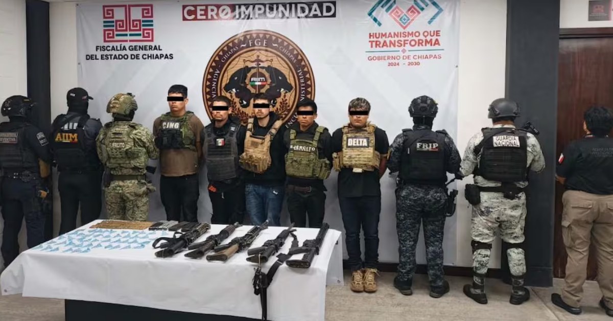 Cinco hombres presuntamente vinculados al Cártel Jalisco Nueva Generación (CJNG) fueron detenidos en el municipio de Ixhuatán, al norte de Chiapas, durante un operativo realizado por elementos del Ejército, Guardia Nacional, Policía Federal y Guardia Estatal.