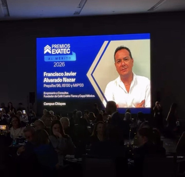 El empresario y consultor chiapaneco Francisco Javier Alvarado Nazar fue nombrado ganador del Premio EXATEC al Mérito 2026, uno de los más altos reconocimientos que otorga el Tecnológico de Monterrey a egresadas y egresados con trayectoria sobresaliente y aportaciones de impacto social.
