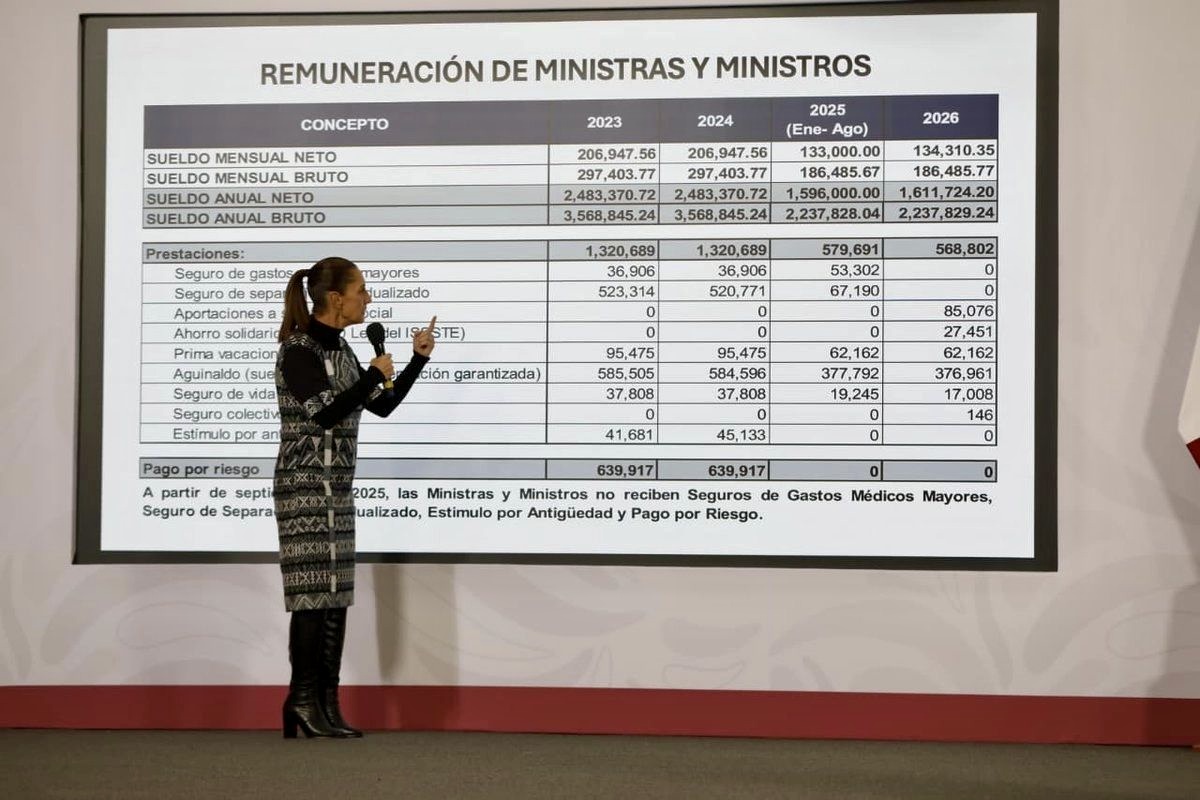 La presidenta Claudia Sheinbaum informó que, con la nueva integración de la Suprema Corte de Justicia de la Nación, las percepciones netas de los ministros se redujeron al pasar de 206 mil a 134 mil pesos mensuales.