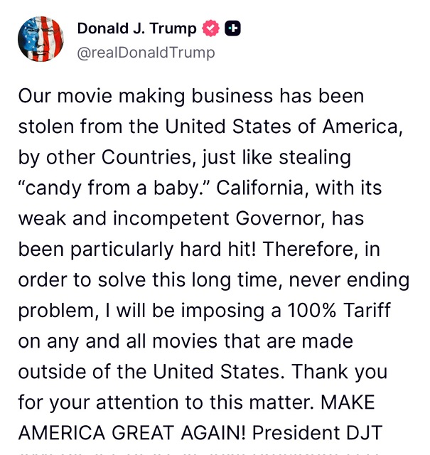 «Nuestro negocio cinematográfico ha sido robado a Estados Unidos por otros países, como si le quitaran ‘un caramelo a un niño’. (…) Por lo tanto, para resolver este problema de larga data, que parece no tener fin, voy a imponer un arancel del 100 % a todas las películas que se hagan fuera de Estados Unidos», escribió en su red Truth Social.